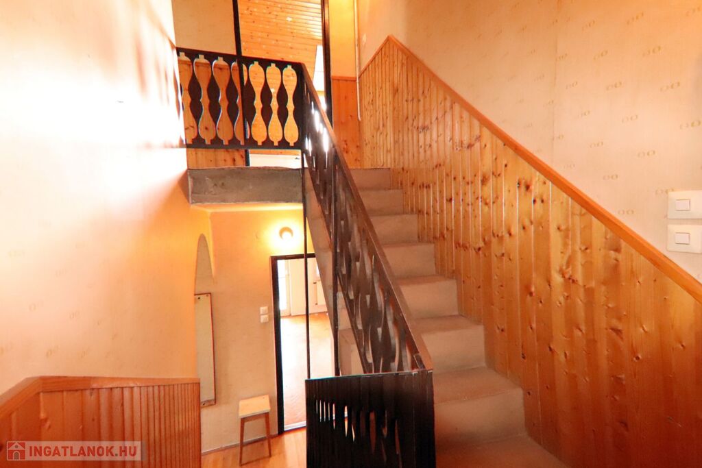 1. szint: 2 nagy szoba egy 8 m2.-es fedett erkéllyel, fürdőszoba WC-vel, közlekedő, lépcső