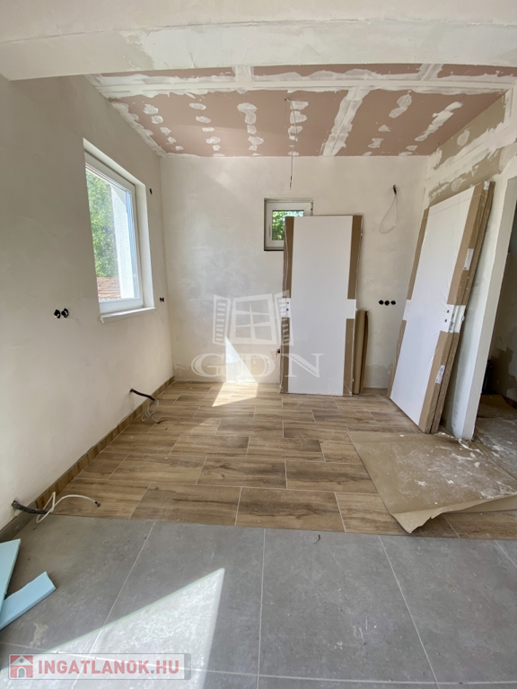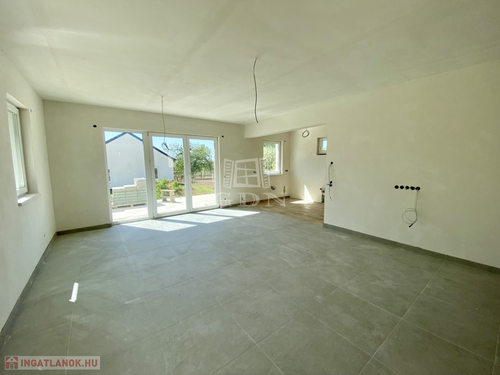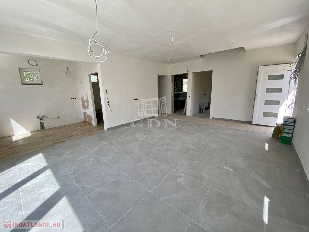 Alsó szinten: világos, déli tájolású amerikai konyhás nappali, két hálószoba, fürdőszoba, valamint egy praktikus kamra, felül még alakíthatóak a helyiségek.