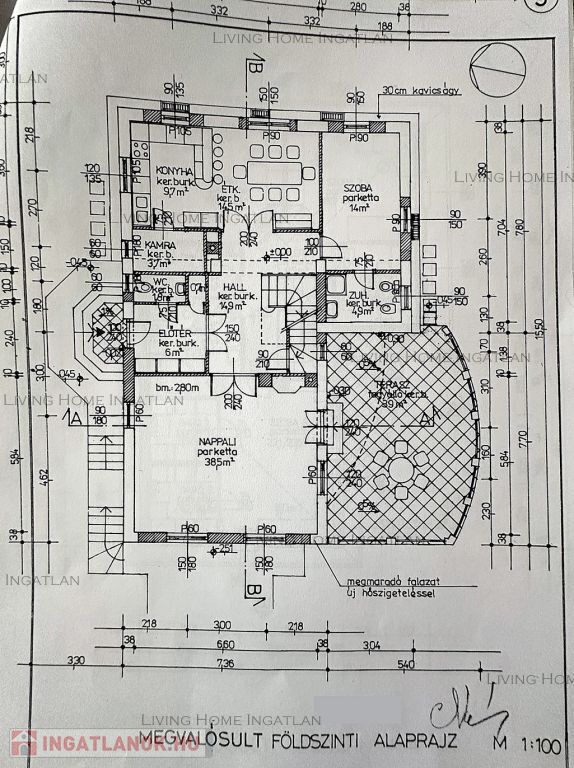 Lakótér: Tágas, beépített bútorokkal felszerelt előszoba, teraszkapcsolatos nappali kandallóval, gépesített konya étkezővel, kamrával. Található itt még egy dolgozószoba tusolós fürdővel. A déli tájolású, 40 nm-es teraszról kiléphetünk a hátsó, elszeparált kertbe.
