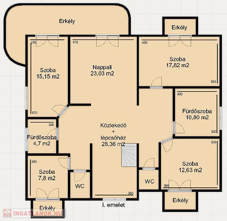 Az emeletre felérve található 4 db hálószoba, 2 db fürdőszoba és egy nappali.