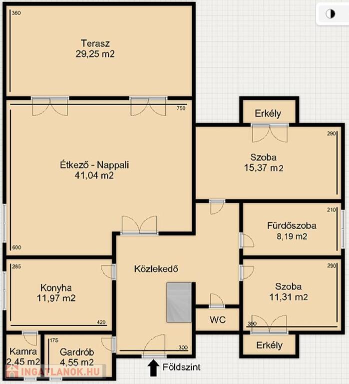 A bejáraton belépve a földszinten található 2 db halószoba, egy fürdőszoba, egy WC, egy konyha és egy 41 m2-es nappali, ahonnan nyílik a 29 m2-es terasz.