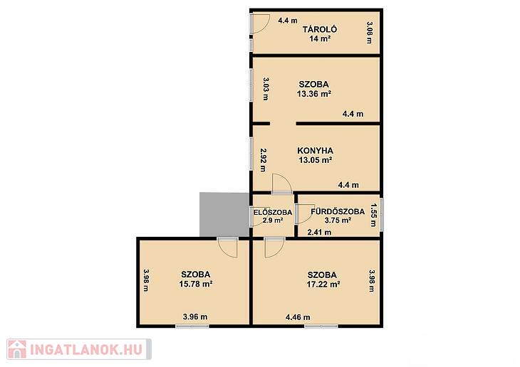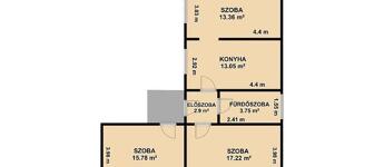 3 szoba, konyha, fürdőszoba + wc, 14 nm-es tároló és 30 nm-es pince.