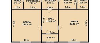 2 szoba, hall, konyha, 2 kamra, kádas fürdőszoba + WC, előszoba, 2 terasz.