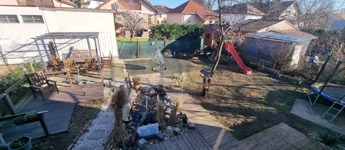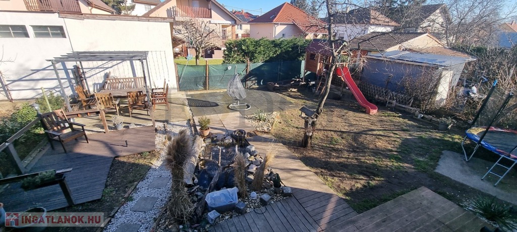 Telek és kert: A telek jelenleg osztatlan közös tulajdon, ügyvéd által ellenjegyzett telekhasználati megállapodással a házrészhez tartozó, privát 215 négyzetméteres telekterülettel. Az elválasztó kerítés kiépítése folyamatban van, a vételár részét képezi. A kert gondozott, WPC burkolatú sétáló- és kiülő résszel, halastóval, valamint több autó számára biztosított parkolási lehetőséggel. Az épület mellett fedett gépkocsibeálló is található.