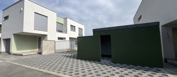 Épület körül nagy méretű trendi térburkolattal, növény sáv elválasztó szegélyekkel, szigetelt kerti tároló. Lapos tetőre jutás 3 rétegű üvegezésű Velux kupolán keresztül történik, belső vízelvezetéssel, szikkasztókkal.