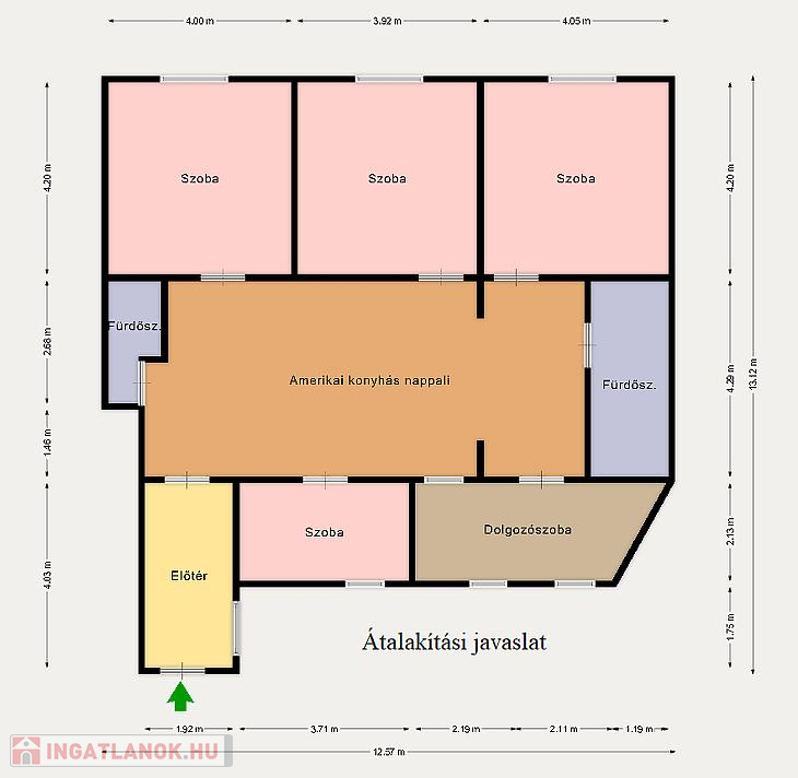A ház adottságainak köszönhetően lehetőség nyílik egy fantasztikus elosztású, amerikai konyhás nappali + 4 hálószobával rendelkező családi otthon kialakítására, melyről átalakítási javaslat is látható a képek között.