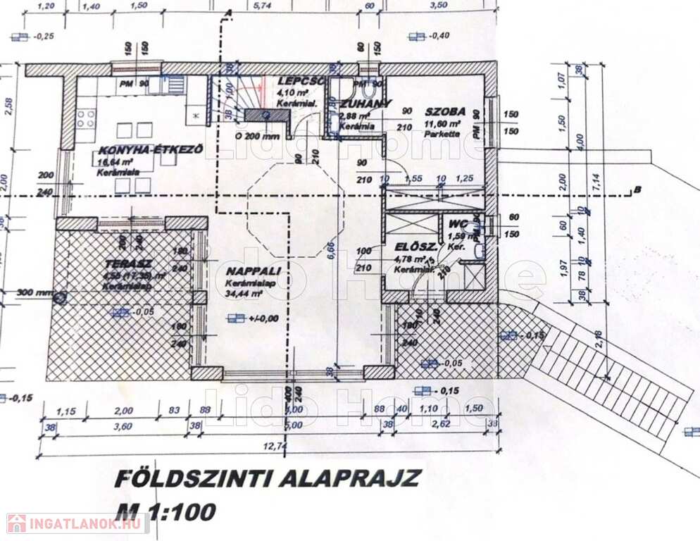 - pinceszint: közlekedő, épületgépészeti – háztartási helyiség, garázs