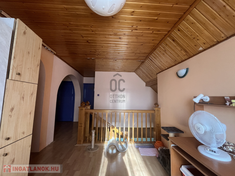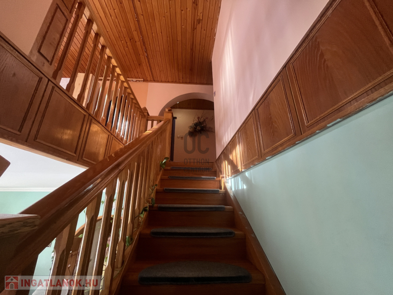 A 140 m²-es, 2 szintes főépület 4 hálószobával, 2 nappalival, 2 fürdőszobával és 2 külön WC-vel kínál kényelmes életteret akár nagycsaládosoknak, akár többgenerációs együttéléshez. Az emeletre vezető gyönyörű, faragott fa lépcső, a tágas terek és a világos szobák mind a minőségi életérzést erősítik.
