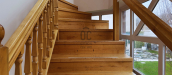 Egy elegáns fa lépcső vezet fel a felső nappaliba.