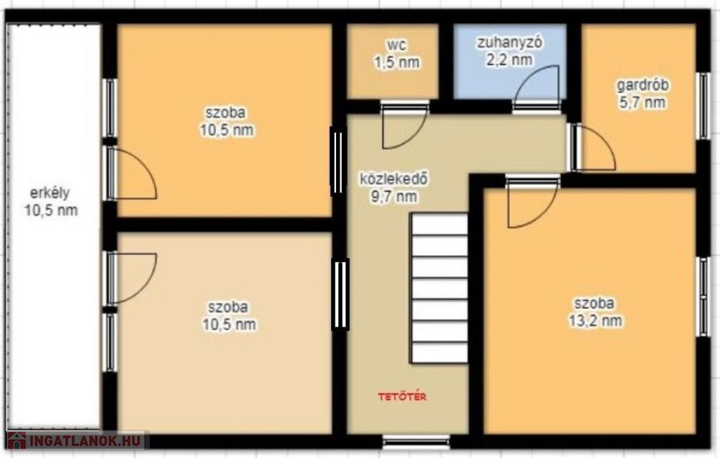 3 szoba (13,2 nm, 10,5 nm, 10,5 nm), gardrób (5,7 nm), zuhanyzó (2,2 nm), WC (1,5 nm), közlekedő (9,7 nm), erkély (10,5 nm)