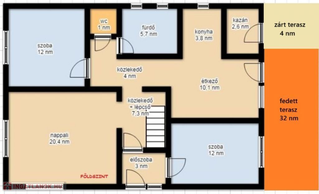 Nappali (20,4 nm), 2 szoba (12 nm, 12 nm), előszoba (3 nm), fürdő (5,7 nm), WC (1 nm), konyha (3,8 nm), étkező (10,1 nm), közlekedő + lépcső (11,7 nm), kazán (2,6 nm), terasz (32+4 nm)