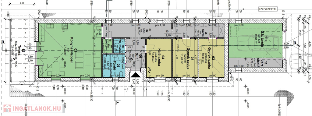 Ez a 99 nm-es, nappali + 3 szobás ház modern kialakítással és prémium anyagokkal készült. A falak 30 cm-es Porotherm téglából és 15 cm-es dryvit szigeteléssel épültek, míg a nyílászárók műanyagból készültek. A fűtést hőszivattyú biztosítja padlófűtéssel, így télen is kellemes meleg vár.