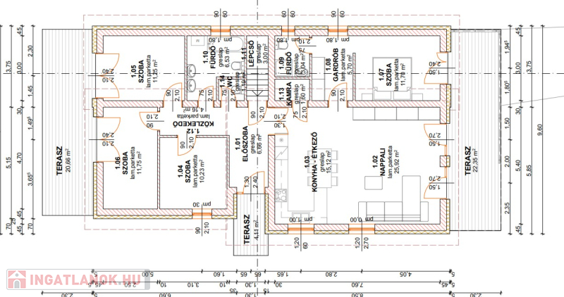 Szerkezeti leírás: Beton alap.Tégla 30-as főfalak + 15cm dryvit szigetelés. Ytong válaszfalak. A külső nyílászárók műanyag szerkezetűek. A belső nyílászárók választhatóak. A tető beton cseréppel fedett.Fűtés hőszivattyúval.
