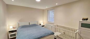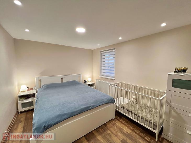 Szomszédságában találjuk a két, külön nyíló, kertre néző, ideális méretű hálószobát és az igényesen felújított, ablakos, épített zuhannyal, mosdóval és wc-vel szerelt fürdőszobát.