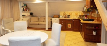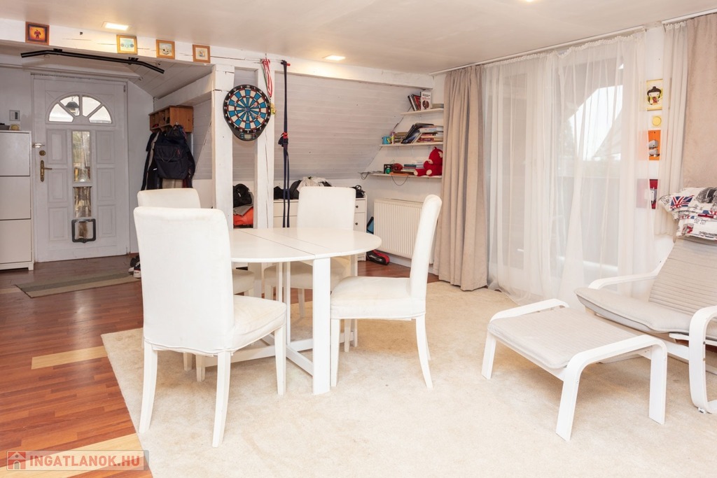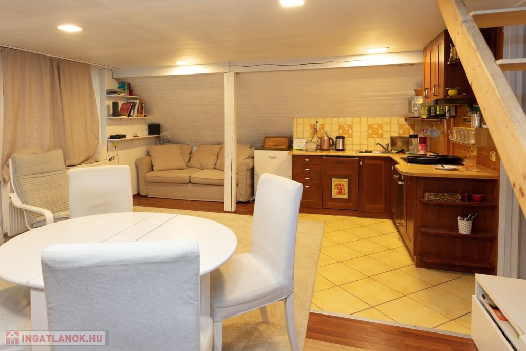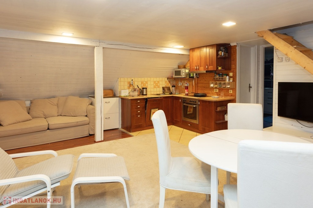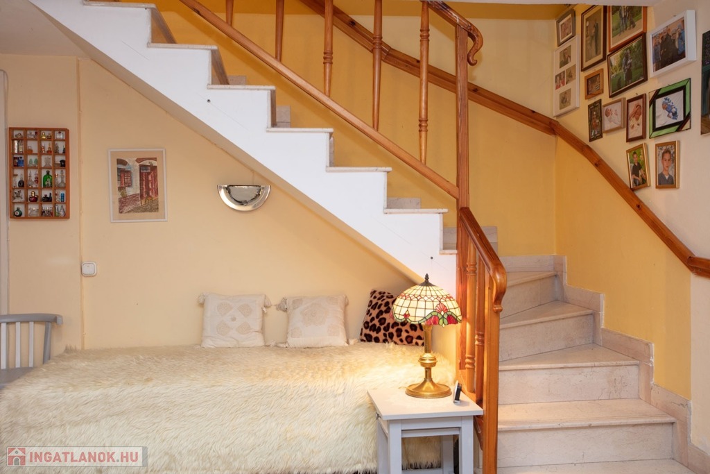 A második, kisebbik lakáshoz egy külső lépcső vezet a felső szintre: 62 nm-en egy amerikai konyhás nappali + háló, kellemes hangulatú 10 nm-es terasz panorámás kilátással, fürdőszobával és egy kis tetőtéri( hálókuckónak, vagy tárolásra alkalmas hely) galériával kiegészítve.