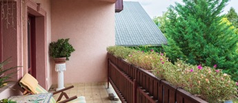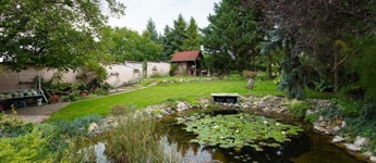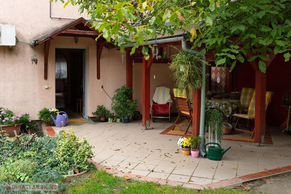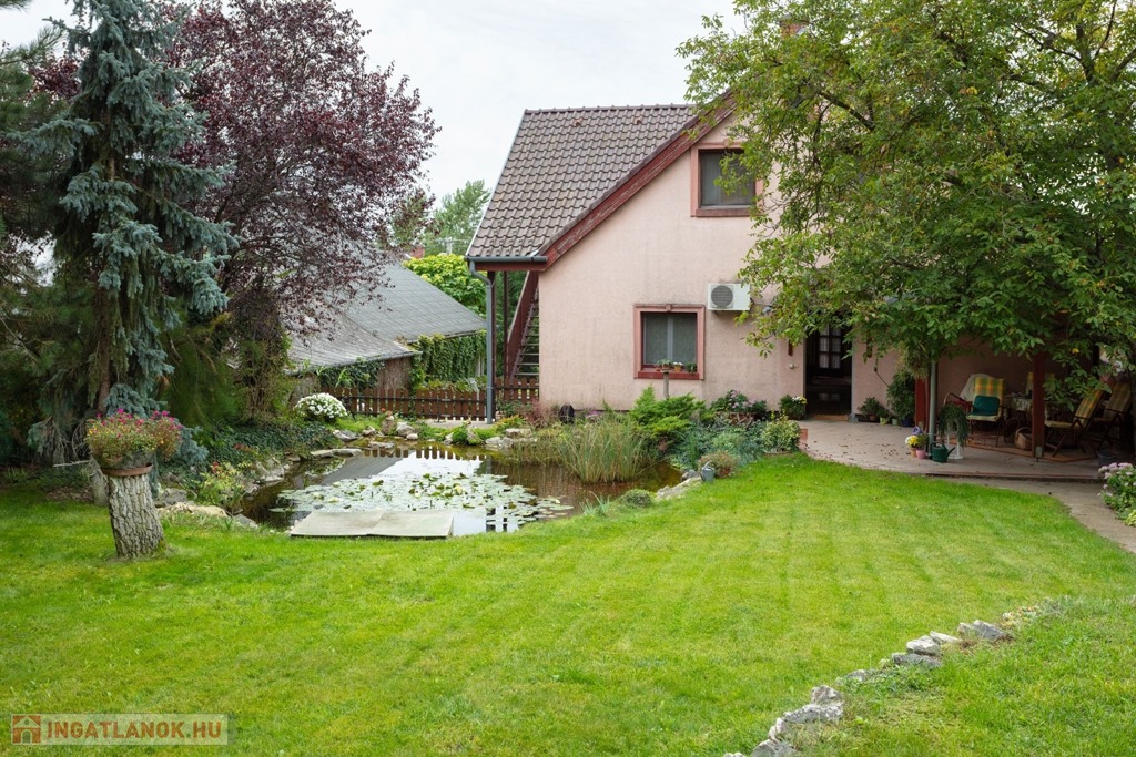 A házhoz egy kényelmes, fedett terasz tartozik, a gondozott kert kitűnő lehetőséget nyújt a pihenésre, kikapcsolódásra, gyönyörködhetünk a halastó és a növények látványában. A kert végében egy kis szerszámok tárolására alkalmas házikó található.