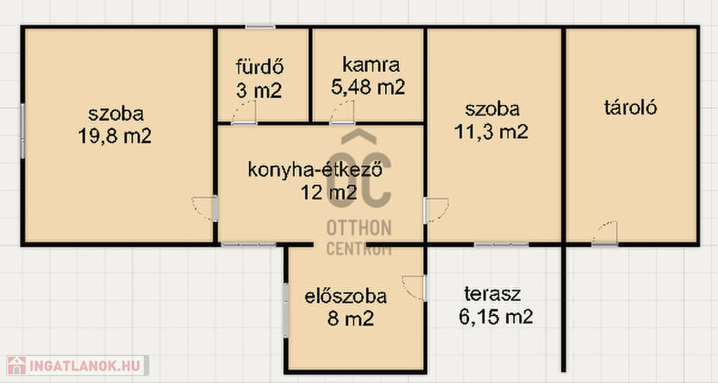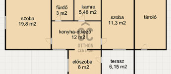 2 szoba, konyha–étkező, fürdőszoba-WC, kamra és előszoba.