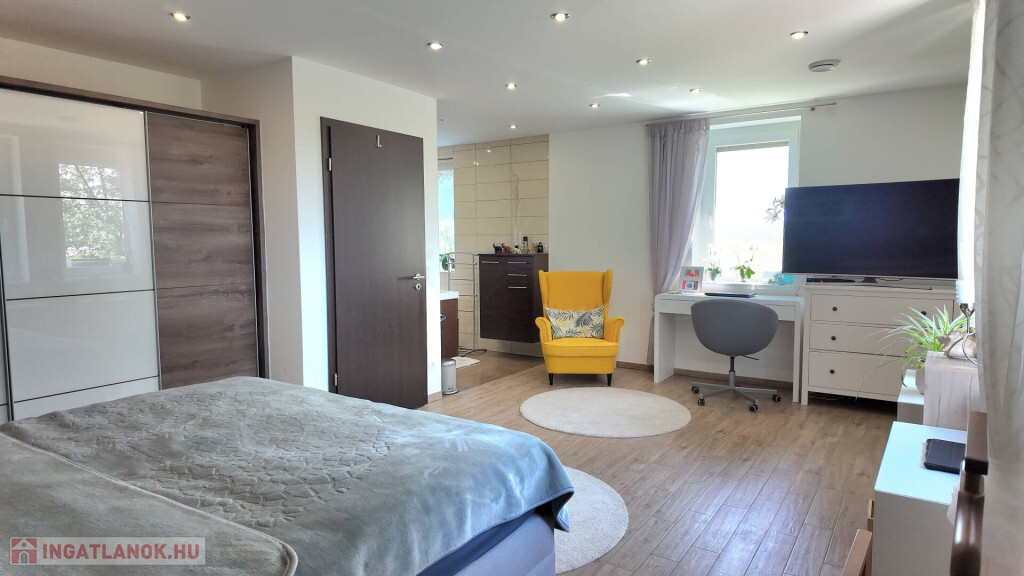 A ház 3 hálószobával, 2 teljesen gépesített konyhával és 3 fürdőszobával rendelkezik. A világos nappali közvetlen kijárattal a 60 m²-es, déli tájolású teraszra, ahonnan csodás kilátás nyílik a soproni hegyekre.