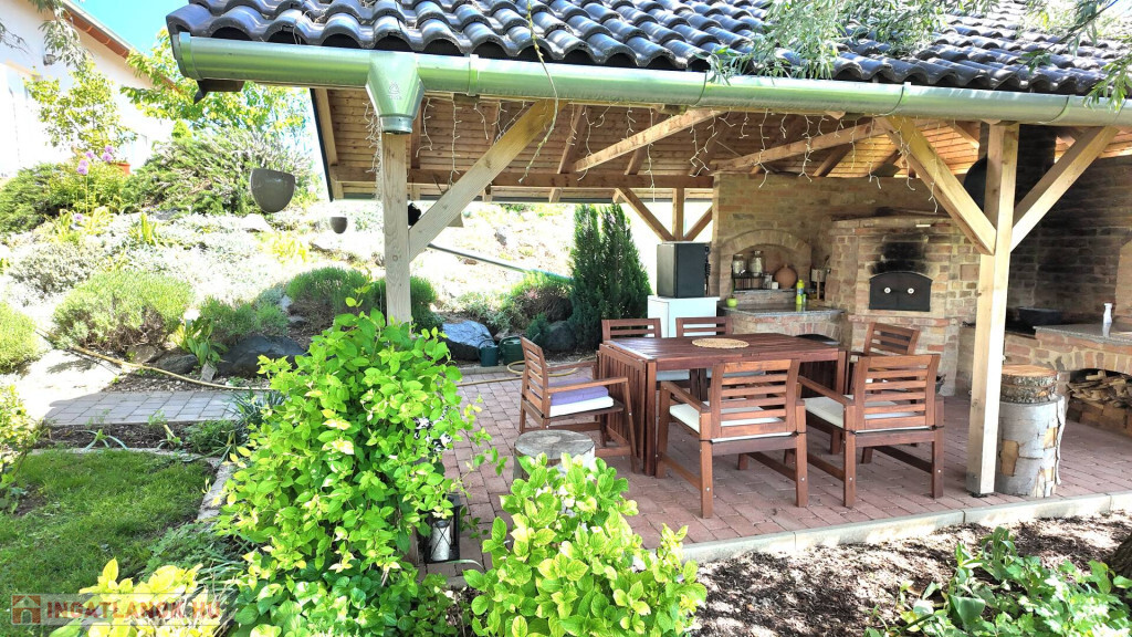 A 1200 m²-es parkosított telek dupla bejárattal és elektromos kapuval rendelkezik. Kialakításra került egy sziklakert, 4000 literes esővízgyűjtővel, mely az egész telek locsolására alkalmas mennyiségű vizet tárol, és 65 méter mély fúrt kúttal, tiszta, fogyasztásra alkalmas vízzel. A fedett kerti kemence/grillező a szabadban való pihenést teszi lehetővé.