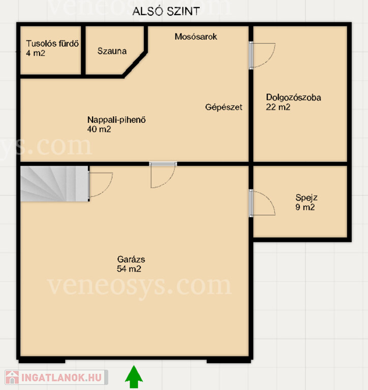 Praktikus alsó szint: Az alsó szinten dupla garázs, tágas spejz, dolgozószoba és közösségi tér található, szaunával és tusolós fürdővel kiegészítve.