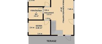 Földszint: 2 szoba, amerikai konyhás nappali, zuhanyzós fürdőszoba + mellékhelyiség, közlekedő