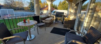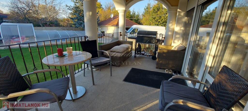 A hátsó udvar igazi kikapcsolódási központ: fedett, fűtött, 8×4 méteres medence várja a pihenni vágyókat, távirányítós kapuk, fedett terasz és parkosított környezet teszik teljessé a kényelmet.