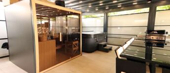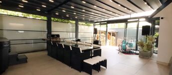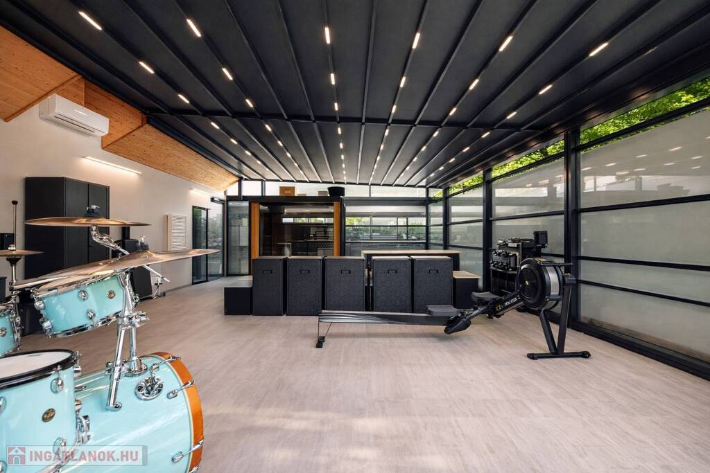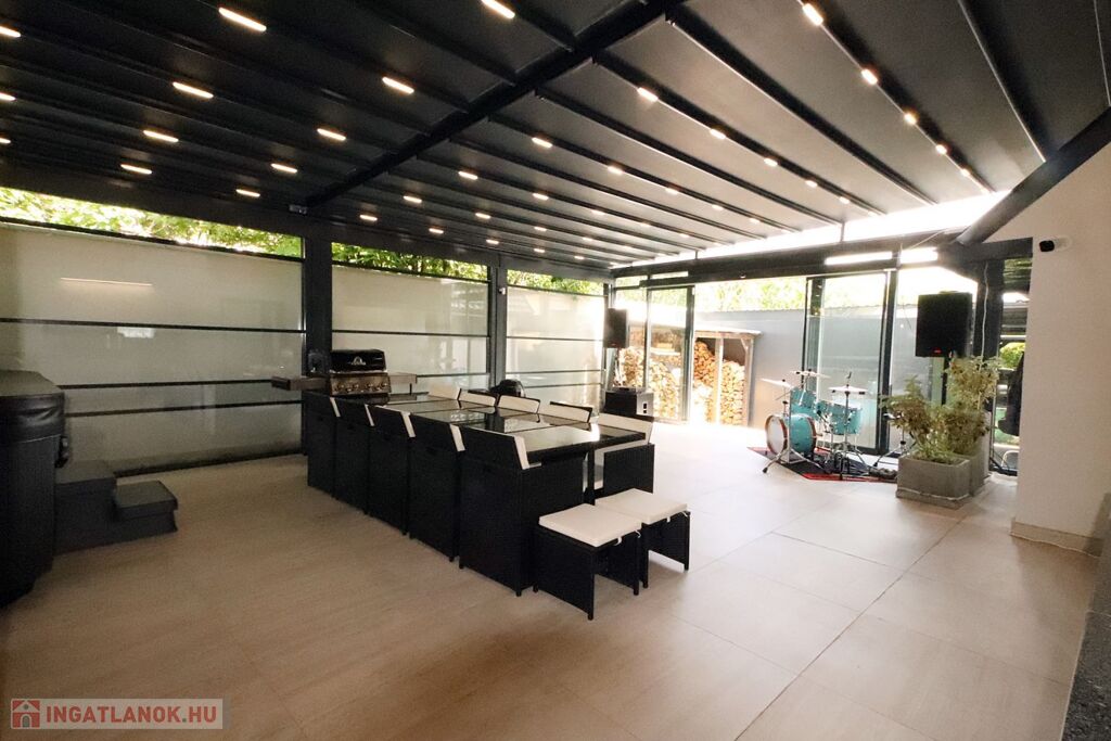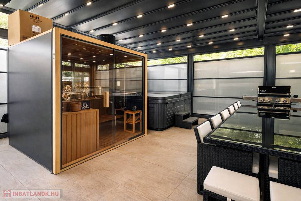 A ház szerves része egy 66,8 m2-es hatalmas, FEDETT, minden oldalról zárt TERASZ, melynek teteje és oldalablakai is elektromosan teljesen elhúzhatóak. Itt található a WELLNESS részleg egy 8 személyes SZAUNÁVAL, 6 személyes JAKUZZIVAL, melyhez zuhanyzós fürdőszoba is tartozik. Az óriási méret lehetővé teszi nagy társaságok vendégül látását is, melyhez külön konyha és 12 személyes kerti bútor áll rendelkezésre. 14 m2-es nyitott TERASZ.