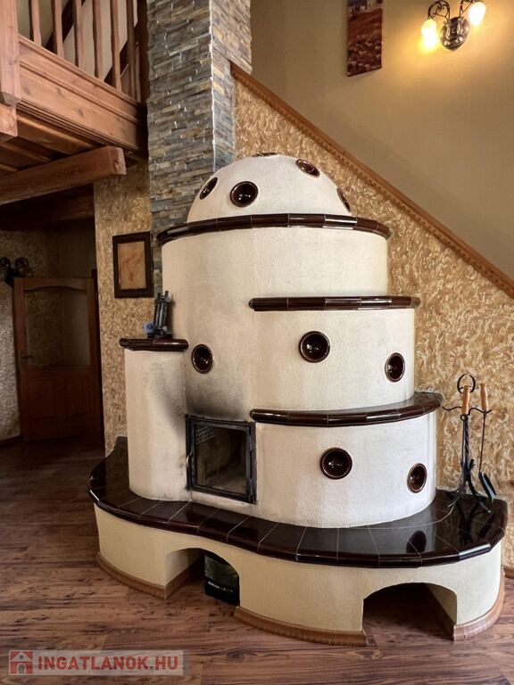 A nappaliban alternatív fűtési lehetőségként szemet gyönyörködtető és kiválóan működő cserépkályha található.