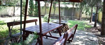 A ház igényesen körbekerített, parkosított udvarát egy kapun keresztül lehet megközelíteni, majd az udvar végén található dupla garázst használni. A garázsban villany, víz található. Az udvar végén egy hűvös, fákkal körbeültetett kiülő és egy szép sütő hely is ki lett alakítva.