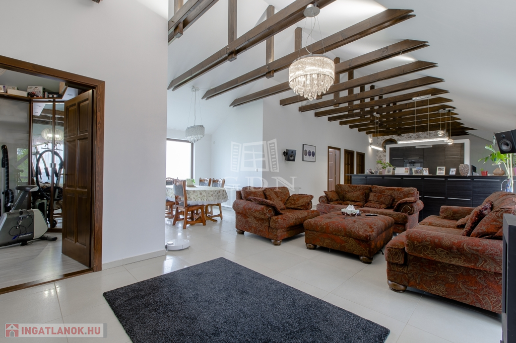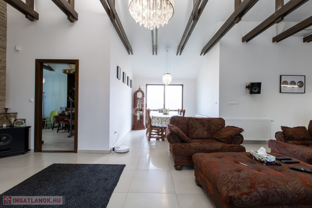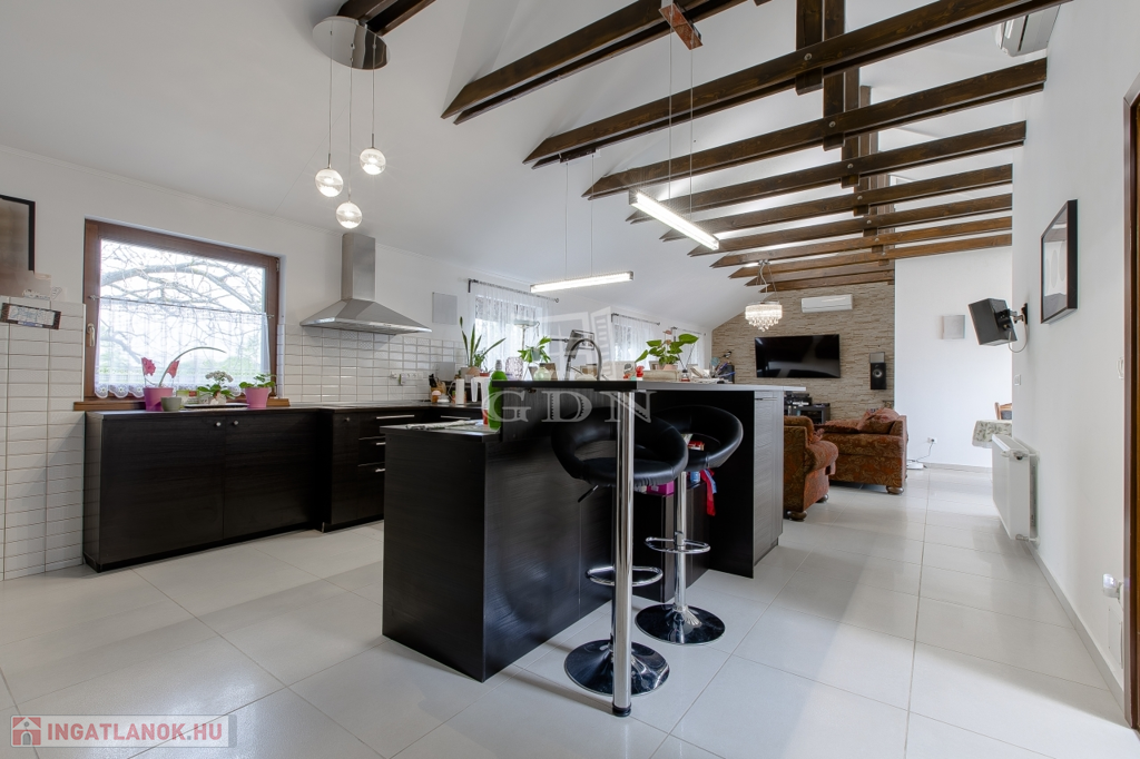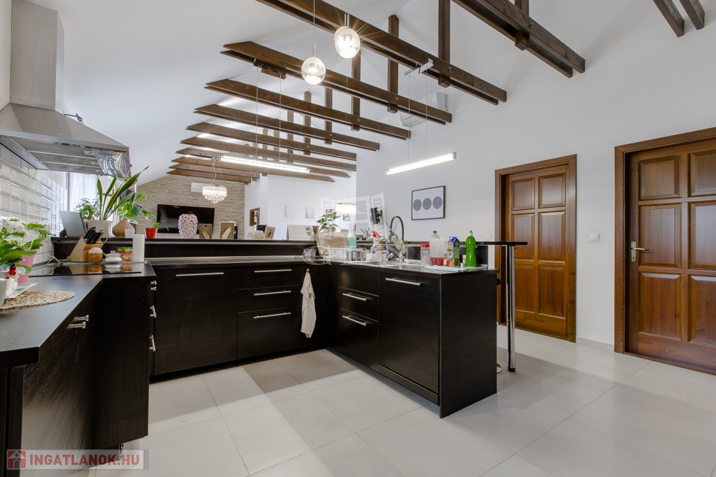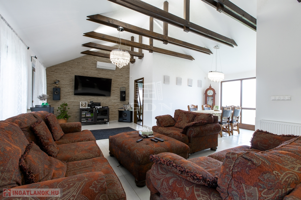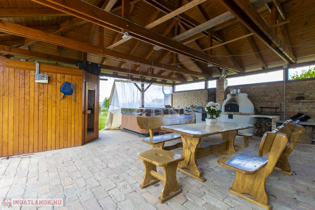 Belsőterek rendkívül ötletesen és ízlésesen vannak berendezve, gépesített IKEA konyhabútor, számos beépített gardrób, illetve cipősszekrény, gépesített mosókonyha áll rendelkezésünkre. Kikapcsolódásért nappaliban házimozi rendszer, az udvaron pedig fedett kerti konyha (épített grill, kemence, bográcsozó) és wellness (szauna, hatalmas jakuzzi) részleg áll rendelkezésünkre.