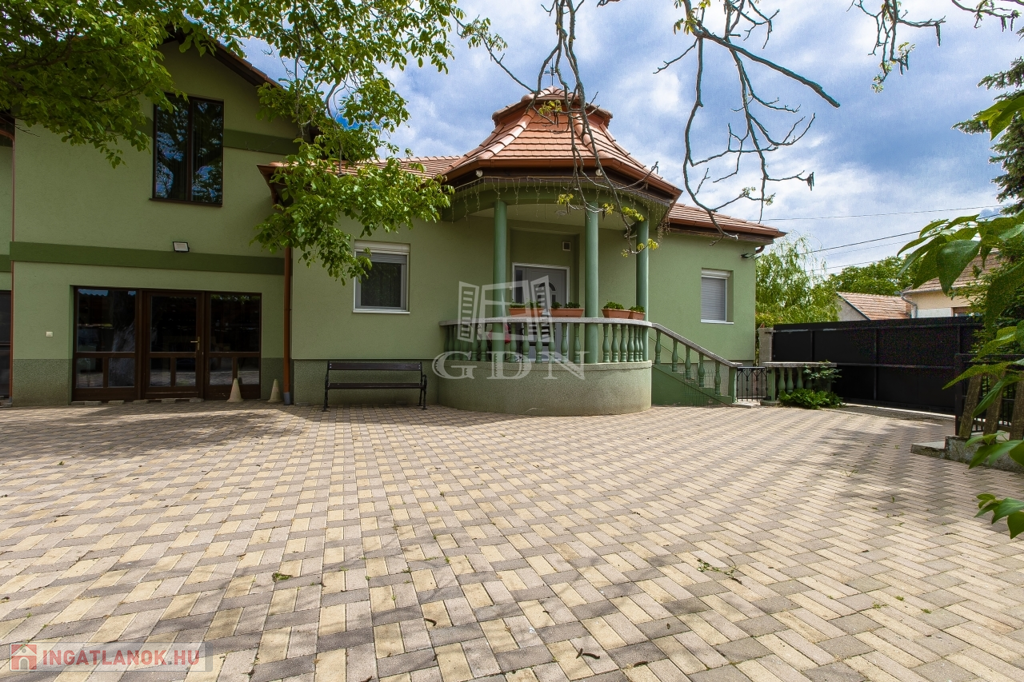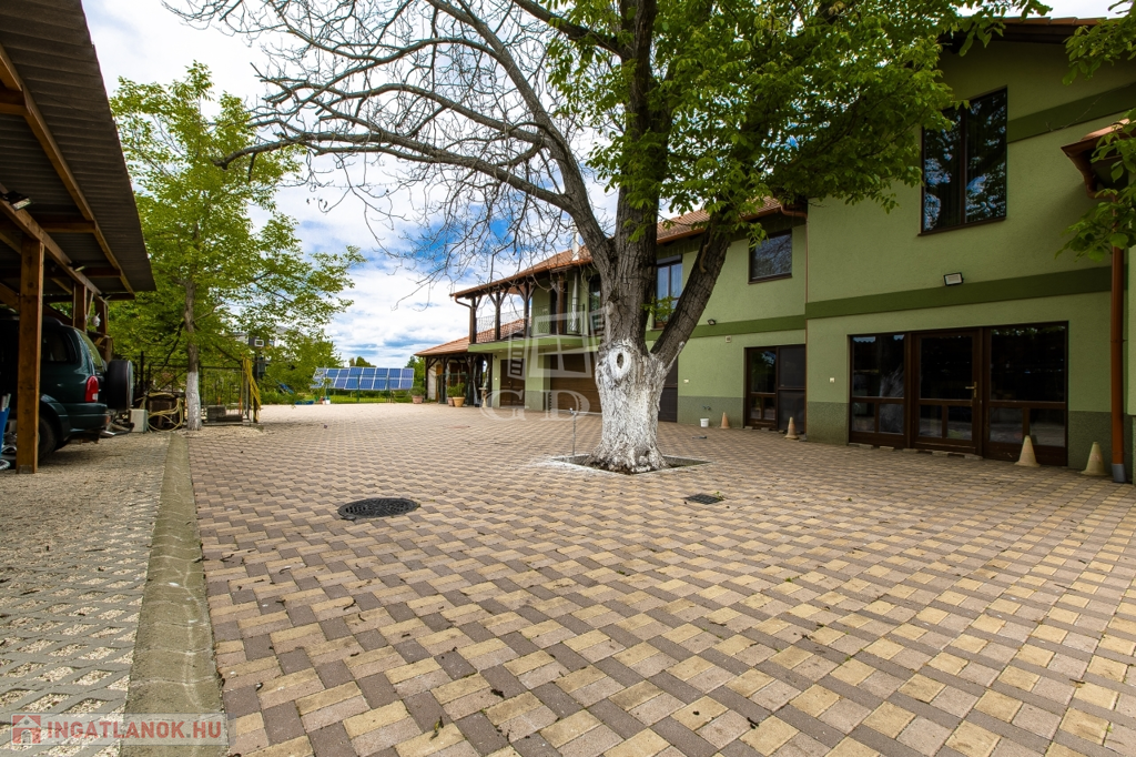 Az ingatlan megközelítése elektromos kapun történik, biztonságért riasztó illetve kamera rendszer felel.