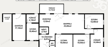 - Lakótér 110,28 m2, garázs 17,10 m2, terasz 14 m2, tároló 3,3 m2, 480 m2 telek (lásd alaprajzon)