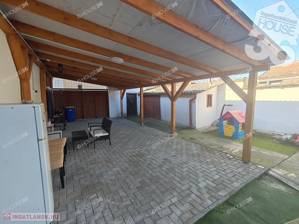– Kert és terasz: 36 négyzetméteres fedett, térkövezett terasz, amely gépkocsibeállóként is funkcionál.