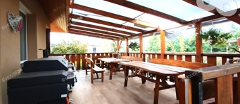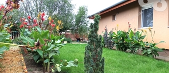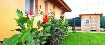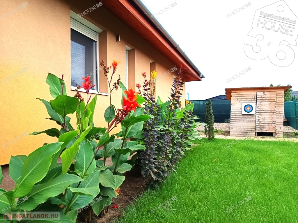 Parkosított kert: A ház körüli kert gyönyörűen gondozott, biztosítva a teljes privát szférát, amelyhez egy játszótér is tartozik.