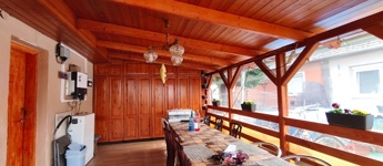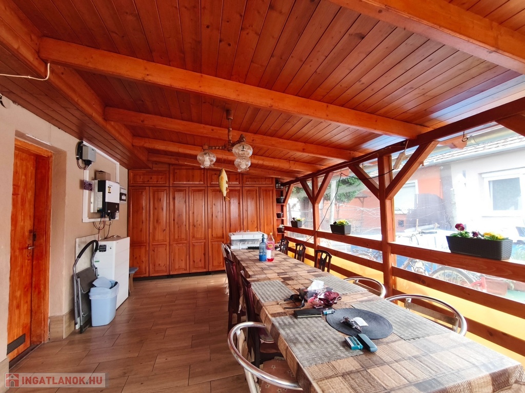 Hatalmas, gyönyörűen fedett, beépített szekrényes terasz, amely tökéletes helyszíne lehet a baráti összejöveteleknek.