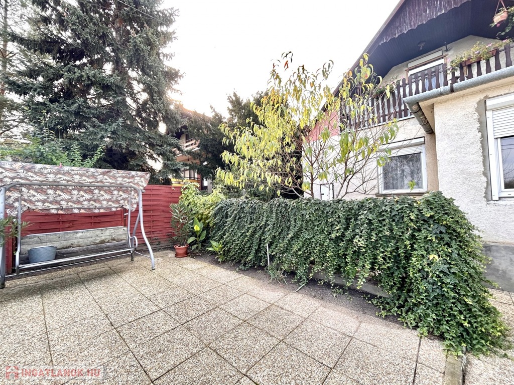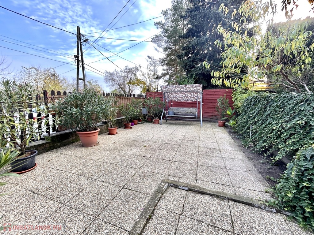 A kert első része modern burkolattal ellátott ezáltal könnyedén tisztántartható, a hátsó része pedig füvesített néhány gyümölcsfákkal, szőlővel, növényekkel ültetett. A parkolásra saját garázs áll a rendelkezésünkre.