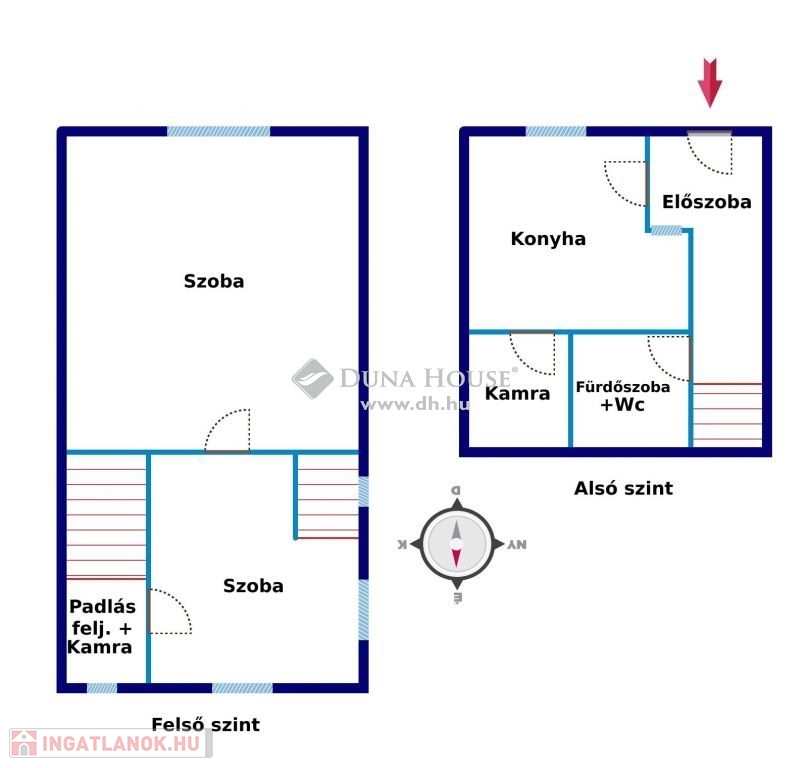 Az ingatlan alsó szintjén egy konyha, egy kamra, egy fürdőszoba+wc, és egy előszoba - közlekedő helyiségek találhatóak, míg felső szintjén két szoba, és egy padlásfeljáró helyiség található, mely tárolónak, gardróbnak is remekül hasznosítható. mindkét szint teljes értékű, a felső szint sem tetőtéri. A tetőtér, padlástér lakáson belülről elérhető, akár a lakótérhez is nyitható, így a ház bővítésére is nyílik lehetőség.