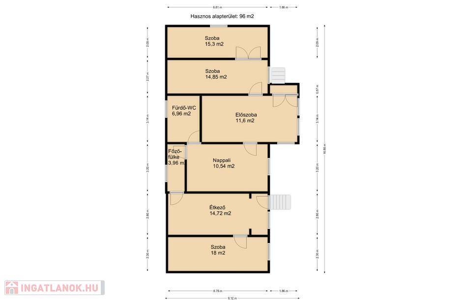 Élhető belső elosztás: 96 m2-en 3 külön szoba, egy nappali, étkező, főzőfülke és fürdő-WC várja.