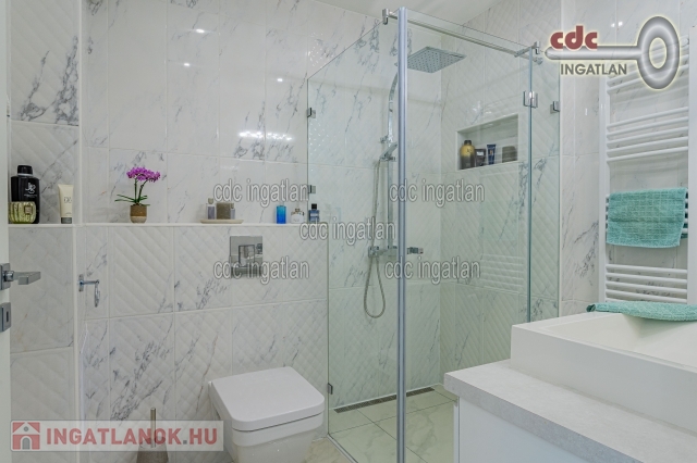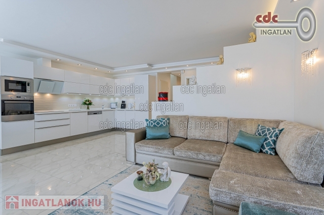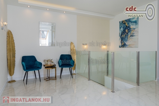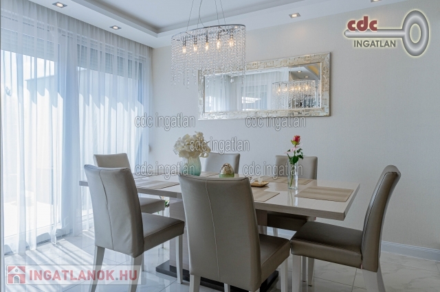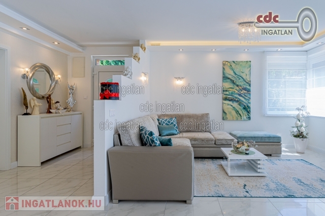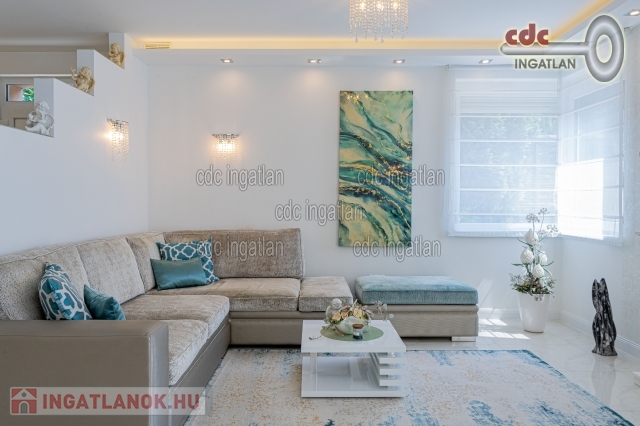 Mogyoród Rózsadombján új építésű házak szomszédságában kínálom megvételre ezt a Buda felé panorámás telken, prémium kategóriás anyagokkal kivitelezett, bruttó 182 m2-es, nappali + 5 szobás ikerházat TELJES BERENDEZÉSSEL. Az ingatlan 2017-ben épült, Budapest határától 5 km-re fekszik, közel az M3-as új lehajtójához. A kiváló elhelyezkedésnek köszönhetően a Hősök tere 13-15 perc alatt autóval elérhető. A közelben élelmiszerbolt, posta, gyógyszertár, orvosi rendelő, iskola, óvoda, bölcsőde, buszmegálló. Az épület 30-as Porotherm téglából épült 10cm-es válaszfalakkal, 15cm-es grafitos hőszigeteléssel, monolit vasbeton födémmel és az emeleten 20cm-es kőzetgyapot szigeteléssel. A közös fal 30-as Silka hanggátló falazat. A fűtést és a meleg vizet Ariston Clas B 24kw-os tárolós kondenzációs gázkazán biztosítja. A szobákban radiátoros hőleadás, a többi helyiségben (nappali alsó-felső, előszoba, közlekedők, gardrób, fürdők, kamra) padlófűtés került kiépítésre. Nyílászárók: Schüco 3 rétegű üvegezés, hő- és hangszigeteléssel. A korszerű és minőségi anyagoknak, gépeknek köszönhetően a ház átalánydíjas fűtési költsége havi 12.000 Ft. Az építkezés során elsődleges szempont volt a minőség és hosszútávú fenntarthatóság, ennek eredményeként csak prémium anyagok és elképzelések valósultak meg. Az építkezés minden részlete fényképekkel dokumentálva. Mindenhol mosható falfesték és mosható tapéta. Konyhastúdió által készített egyedi konyhabútor első osztályú gépekkel, gránit mosdóval éa magasfényű akril frontokkal. Mindenhol energiatakarékos beépített gépek (Electrolux, Cata), led-világitás (kristály-lámpákkal, spotokkal és gipszkarton szigetekkel, dobozolással, led-szalaggal), hálózatbővítés: 3x16 Amper. Riasztó(távfelügyelettel) 2 kezelővel, alsó és felső szinten, mozgásérzékelővel, továbbá kamera és videó-kaputelefon került kiépítésre. Felső kategóriás olasz (Ascot) csempe és járólapok, illetve a szobákban Egger 8 mm-es parketta, hálóban portaszító szőnyeg. Szaniterek és csaptelepek: Villeroy and Boch, illetve Teka márkájúak. 2db 3,5kw-os klíma került beépítésre, amely szintenként biztosítja nyáron a kellemes hőmérsékletet. A legtöbb kiegészítő, ülőgarnitúra, étkezőasztal, székek, szőnyegek az Art and Deco lakberendezési boltból lettek beszerezve. A kertben gyepszőnyeg, illetve örökzöldek kerültek telepítésre, 2x2 zónás automata öntözőrendszer csepegtetővel, illetve esőérzékelővel. A kerítés gondozásmentes \nívó\ acélkerítés. Elektromos távirányítású úszókapu, kerti zuhany, kis faház tárolásra, szerszámoknak, kerti gépeknek, illetve két állásos fedett kocsibeálló is megépítésre került. IDE VALÓBAN ELÉG CSAK BŐRÖNDDEL KÖLTÖZNI! Irányár: 168.000.000 Ft.