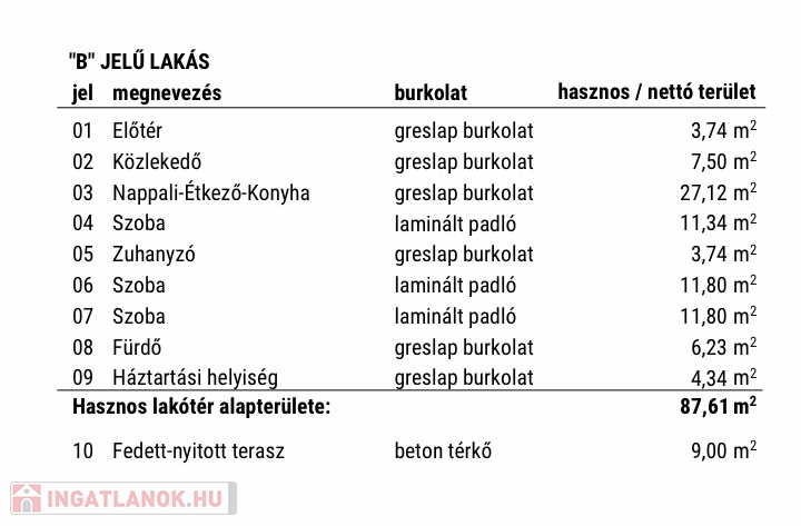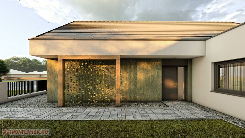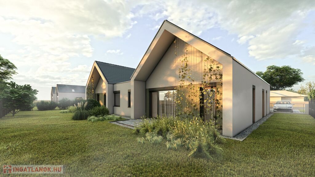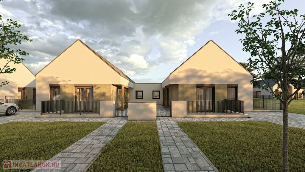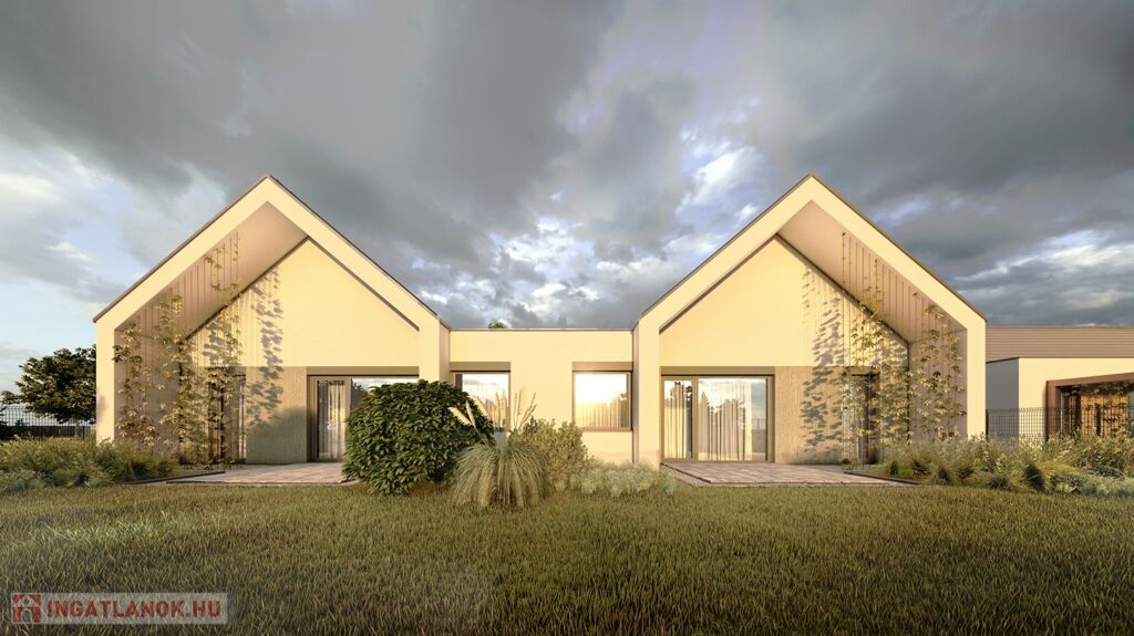 In Mosonmagyaróvár, in Duna Residential Park, NEWLY BUILT semi-detached house with 364 m2 plot, 87.61 m2 usable floor area, 3 rooms + living room, excellent floor plan layout, built with high technical content, equipped with energy-saving heat pump heating system, partially covered terrace of 9 m2 , for sale in a ready-to-build condition with a paved parking space. Price: HUF 79,800,000 Contact: +36-20-36-44-444 The semi-detached houses under construction are located in the inner area of Mosonmagyaróvár in the newest part of the Duna residential park. The residential park has a fully developed asphalt road network and utility system. Load-bearing structures, masonry: construction of Porotherm system masonry (Leier, Wienerberger) from 30 N+F flat-polished bricks with foam bonding. Inside the building, partition wall 10 is brick masonry (Leier, Wienerberger) with foam masonry. Slabs: A monolithic reinforced concrete slab with a thickness of 20 cm will be made above the building, using formwork technology on site with the necessary reinforcement according to the static plans, in the concrete quality prescribed by the static. Roof: Construction of a nail plate structure from soaked pine lumber. Laying of roofing membrane, battens and cladding with concrete tiles in anthracite color. (Terrán, Bramac) Thermal insulation: The residential building will be insulated with 15 cm of glass fabric mesh and sealed with rubbed white colored plaster (1.5 mm). Baumit Creativtop with additional colored plaster (1.5 mm) shown in the visual plans. Inside the building, a total of 17 cm of thermal insulation is made under the floor. Shutters: We use PVC structure windows and balcony doors in tilt-open versions, and in some places with fixed glazing in anthracite color. All facade doors and windows are equipped with 3 layers of glazing. The entrance doors to the apartment are also made of plastic with a heat-insulated styrodur panel and a safety lock. Complete aluminum shutter equipment with remote control operation.