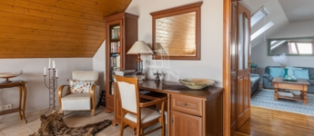 A tetőtérben egy tágas nappali, két hálószoba, gardrób és fürdőszoba kapott helyet. A szinthez kapcsolódik egy részben zárt, 22 m²-es panorámás erkély, ahonnan lenyűgöző kilátás nyílik a környező tájra és a Velencei-tó irányába.