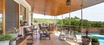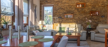Az étkezőből közvetlen kijárat nyílik a teraszra, és a legtöbb helyiség teraszkapcsolattal rendelkezik.