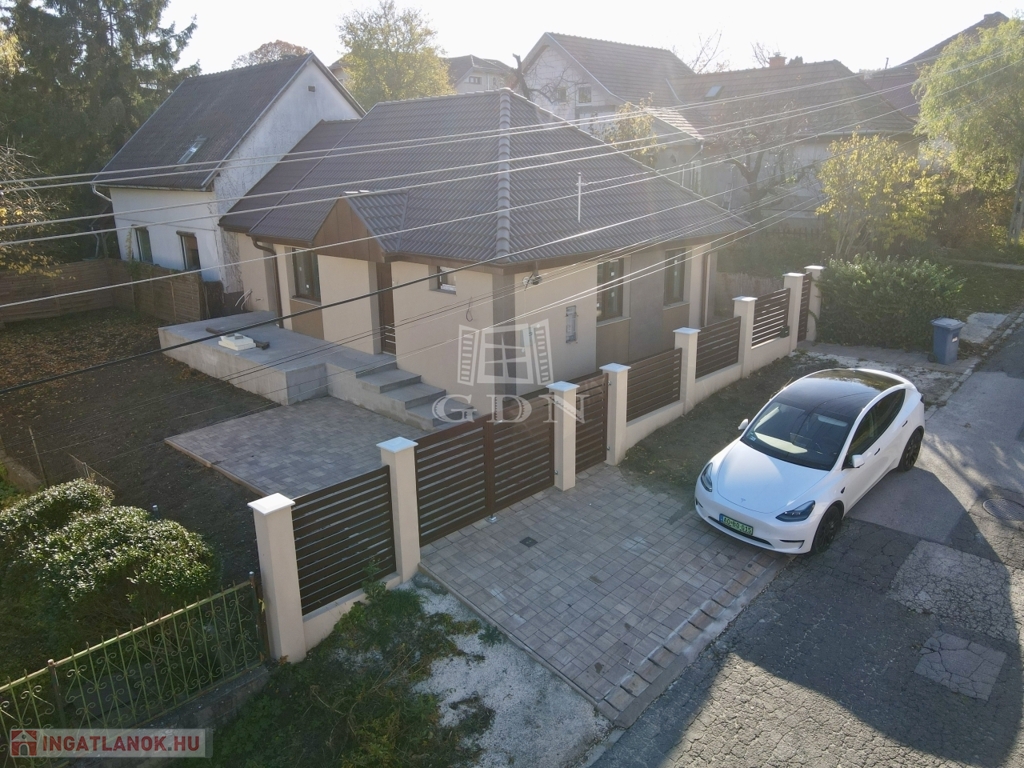 A térkövezett járda és autóbeálló, elektromos kapu, valamint a modern, letisztult kerítés tovább emeli a ház kényelmét és esztétikáját.