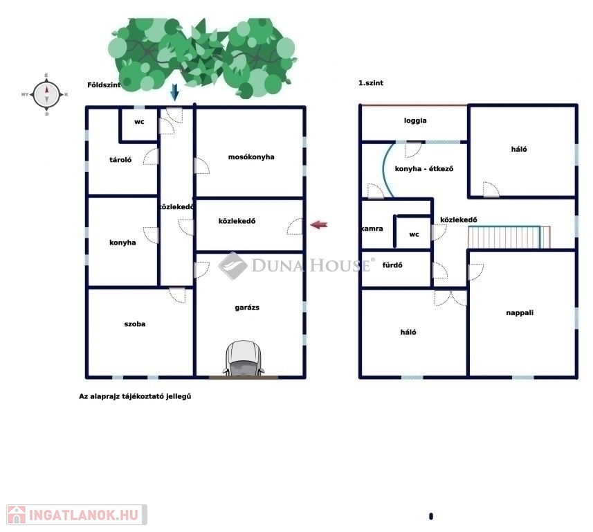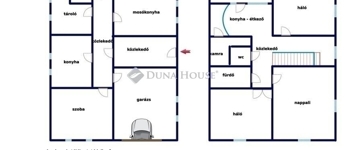 Földszint: szoba, konyha, háztartási helyiség, tároló, WC, közlekedő, valamint az utcáról nyíló 22 m²-es garázs.