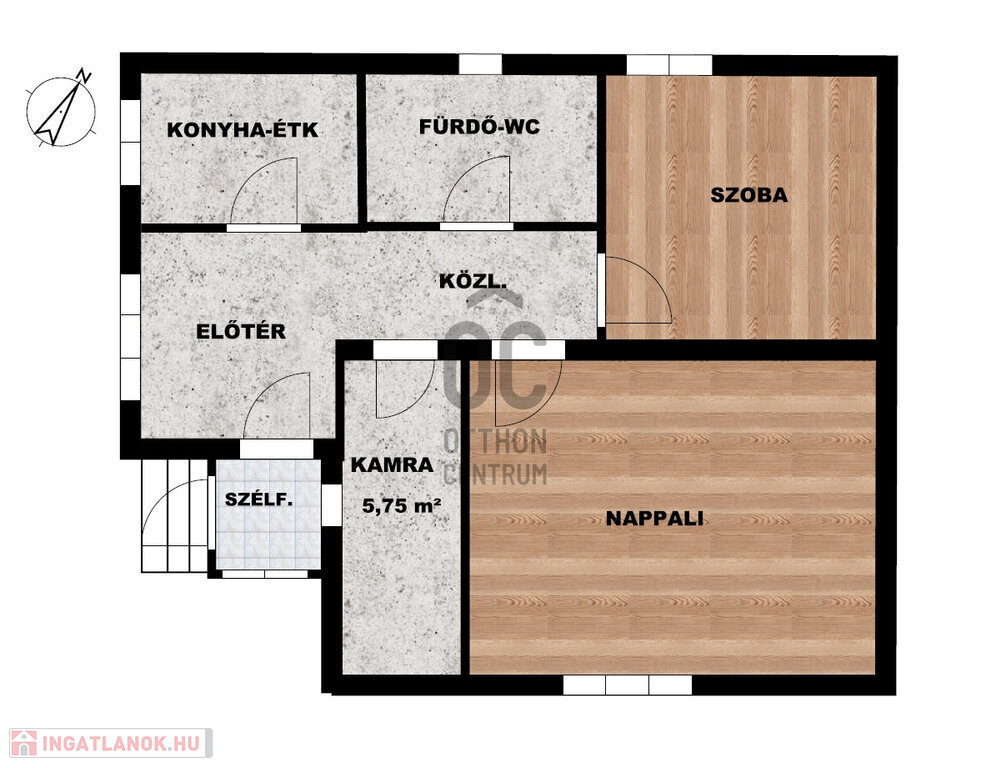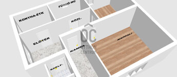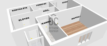A két szobán kívül konyha-étkező, fürdőszoba-WC, kamra, előszoba, kazánház helységek lettek kialakítva.