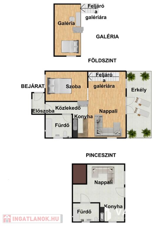 Földszinti lakás fürdőszobából, amerikai konyhás nappaliból, lakószobából, előszobából és egy 20nm-es galériából áll.