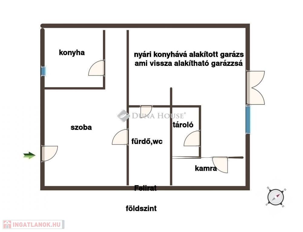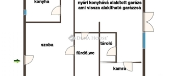 Garázs: jelenleg nyári konyha és tárolóként funkcionál, de bármikor újra garázzsá alakítható. A garázs és kis a lakás egy szinten van, így akár egybe is nyitható és otthoni vállalkozásnak is helyet tud adni.