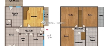 Jelenlegi elrendezésében 2 szinten összesen két konyha, öt szoba, két fürdő, két garázs található. Igény szerint a tetőtér beépíthető, melyhez a vezetékek már fel lettek víve, a lépcső kialakítása és a kartonozás, betonozás is megtörtént.
