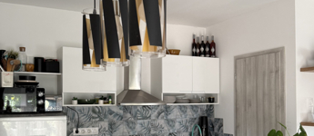 - tágas, világos amerikai konyhás nappali–étkező