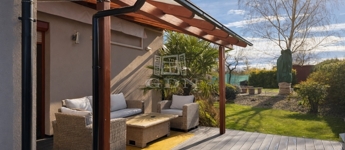 Valamennyi helyiség közvetlen teraszkapcsolattal rendelkezik. Az épület mentén közel teljes hosszban burkolt teraszfelület található, összesen megközelítőleg 60 m² alapterülettel. A hátsó telekrészen jakuzzi elhelyezésére alkalmas közműkiállások kerültek kialakításra.